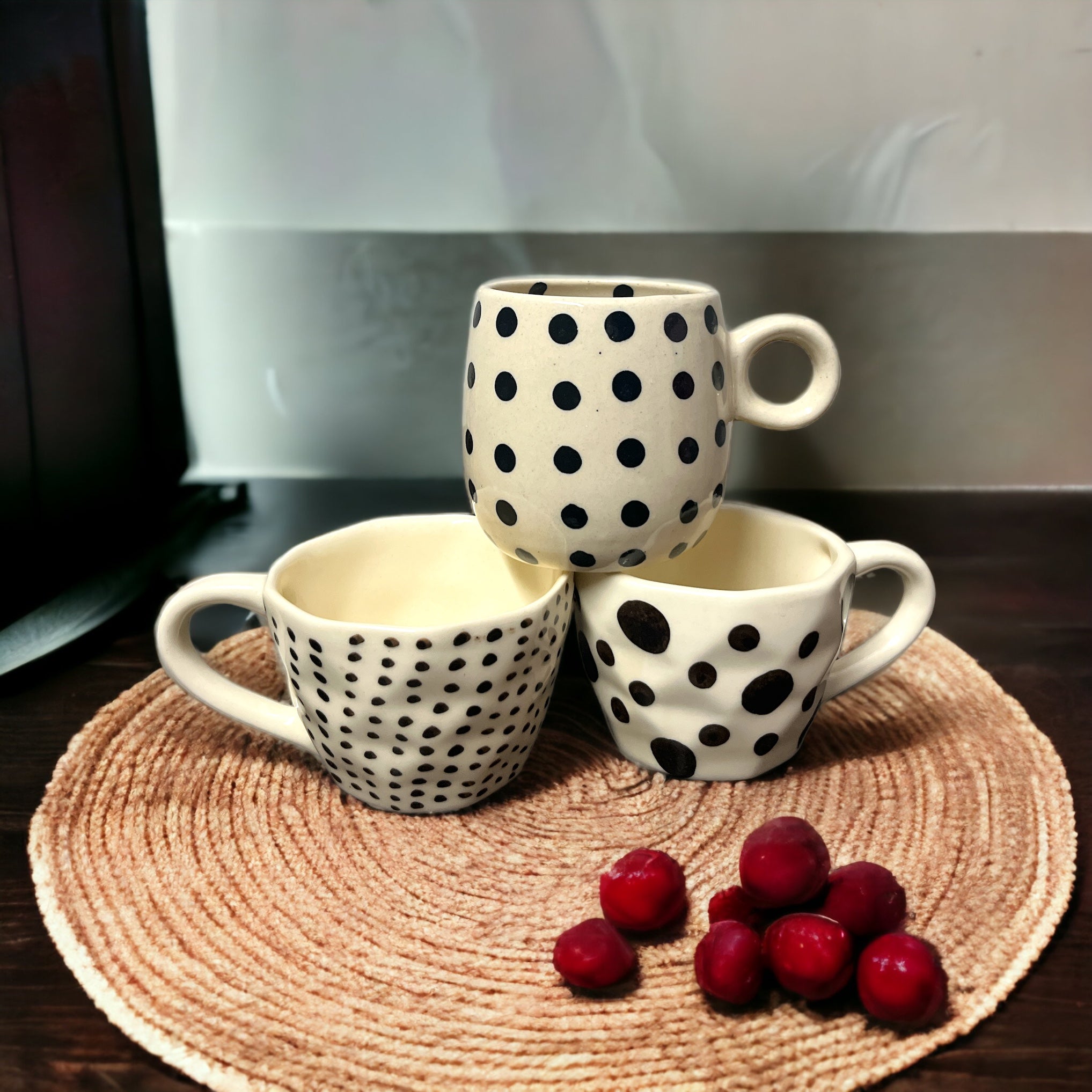 Discover our All Black Polka Dots Mugs Combo (Set of 3) – the trendiest way to enjoy your drinks! These mugs are sleek and covered in bold black polka dots. They're perfect for your daily sips. Grab this combo and add some style to your coffee or tea time!