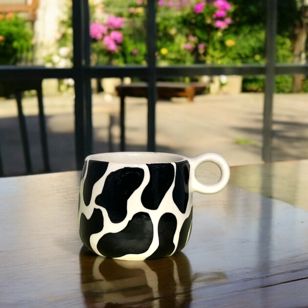 Introducing the Moo Mood Mug: A playful blend of function and farmyard charm. This ceramic mug features striking black and white cow print patterns that transform your daily coffee or tea ritual into a whimsical experience. The bold Holstein-inspired design wraps around the exterior, while the clean white interior lets you easily monitor your beverage level. Perfect for animal lovers and anyone who appreciates a touch of rural charm in their kitchen,