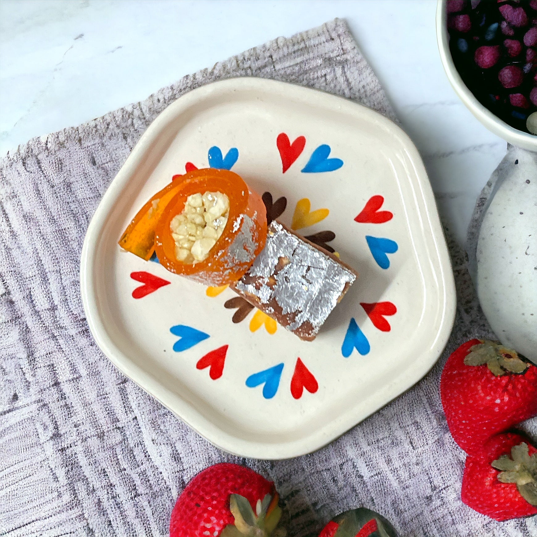 Serve up sweetness on our Multi-Color Heart Dessert Plate, a delightful addition to any dessert table or tea party. This charming plate is beautifully adorned with an array of multi-colored hearts, creating a playful yet elegant pattern that's sure to capture the attention and hearts of your guests. Crafted from high-quality materials, it's perfect for showcasing your favorite pastries, cakes, or afternoon snacks. The vibrant hearts set against a crisp, white background make every dessert time a joyous celebration of love and happiness. Whether you're hosting a special gathering or enjoying a quiet, indulgent moment alone, this dessert plate is designed to bring a smile to your face and warmth to your heart.
