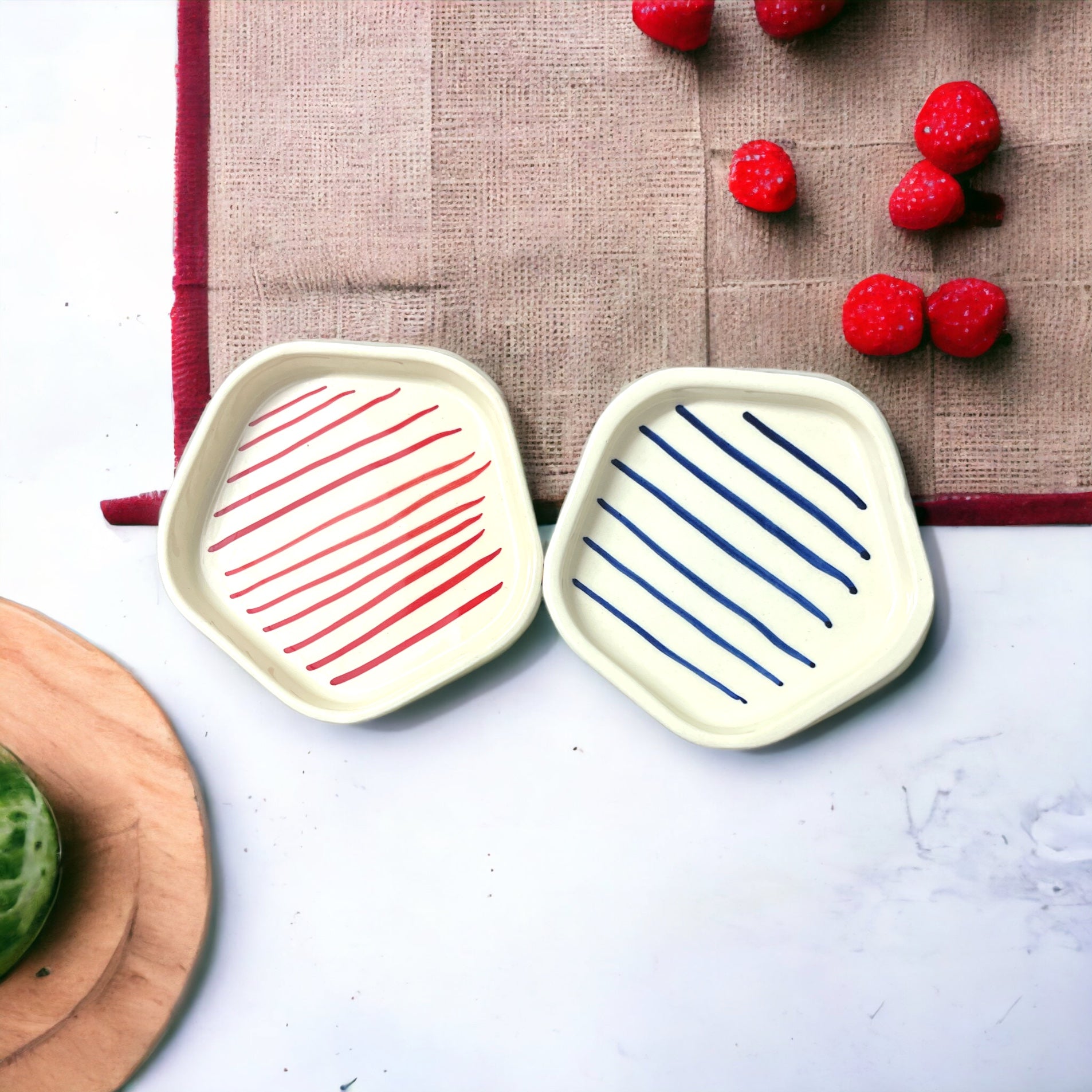 Introducing our Red & Blue Lined Snack/Dessert Plate – the perfect addition to your table! These plates are stylish with vibrant red and blue lines. They're just right for your snacks and desserts. Elevate your serving game with these plates and make your treats look even more appetizing!