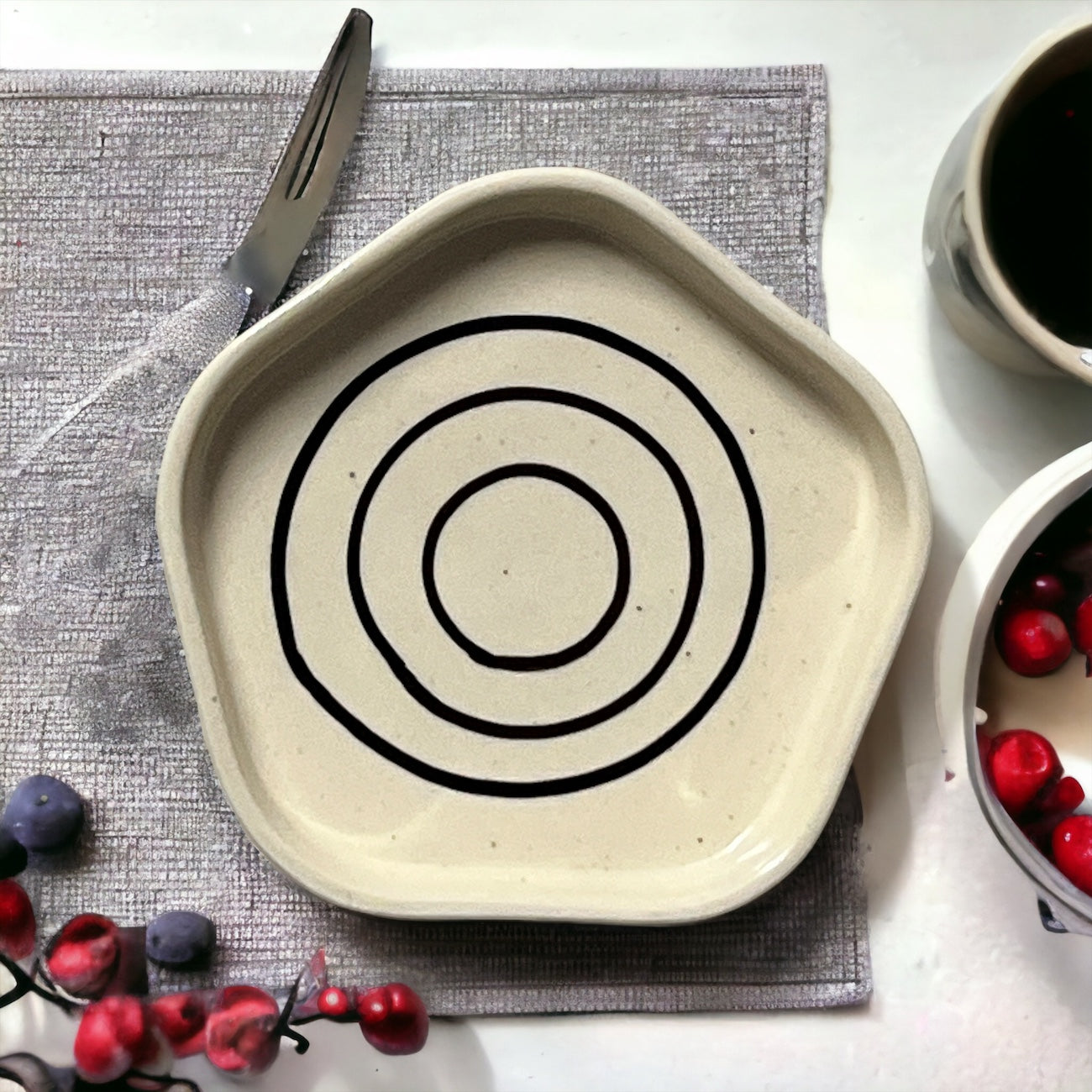 Introducing "The Circles of Joy Dessert Plate" - a delightful and enchanting addition to your dining experience! This ceramic dessert plate showcases a captivating circles pattern that exudes happiness and merriment. Perfectly sized for serving your favorite sweet treats, this plate adds a touch of joy to every dessert presentation. Microwave and dishwasher safe for convenience. Elevate your dessert enjoyment with "The Circles of Joy Dessert Plate."